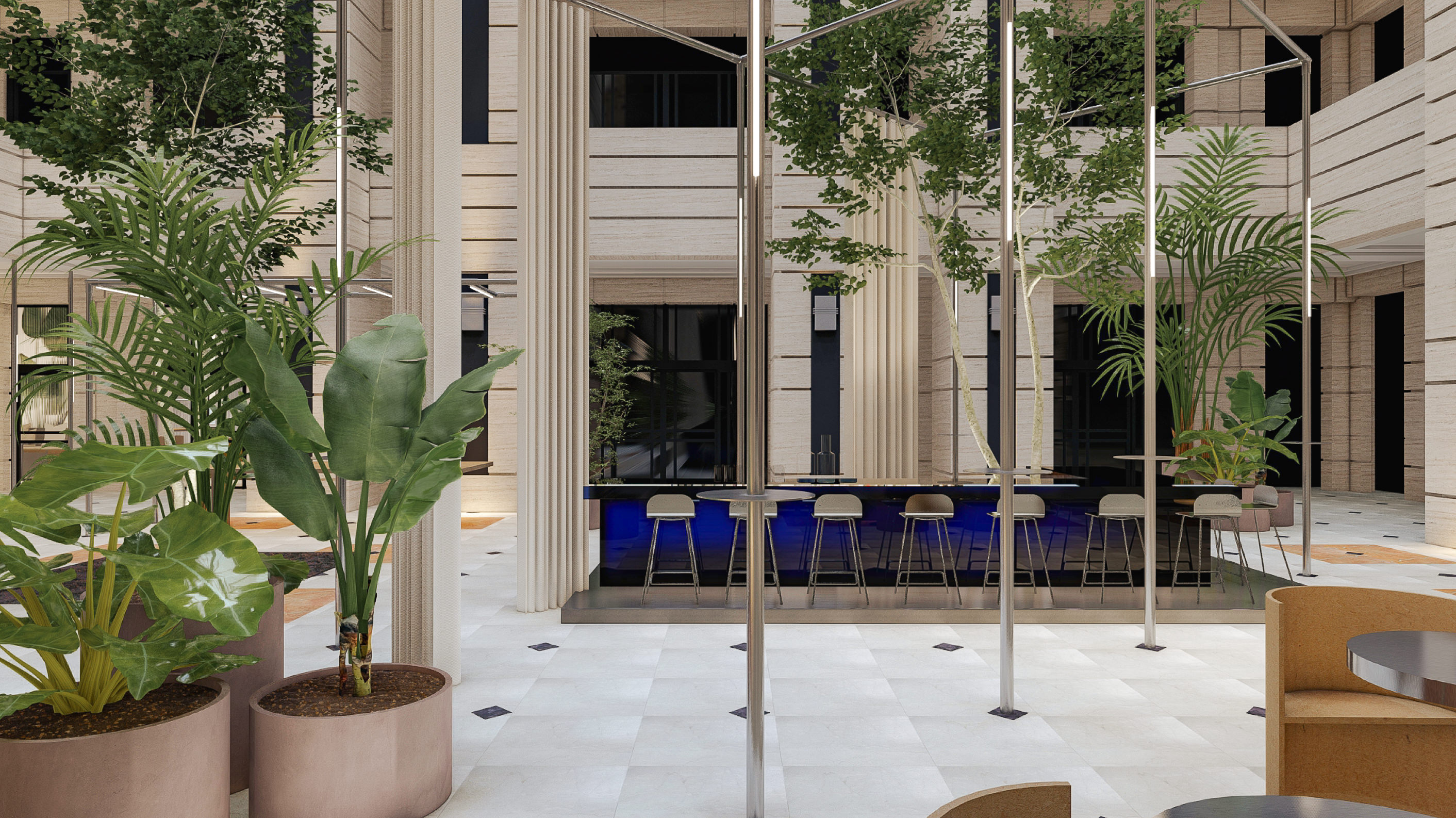 Scaffolding structures interlace the space, not just as supports but also to structure and organize the space. These structures create geometric forms and functions, and also as lighting poles.