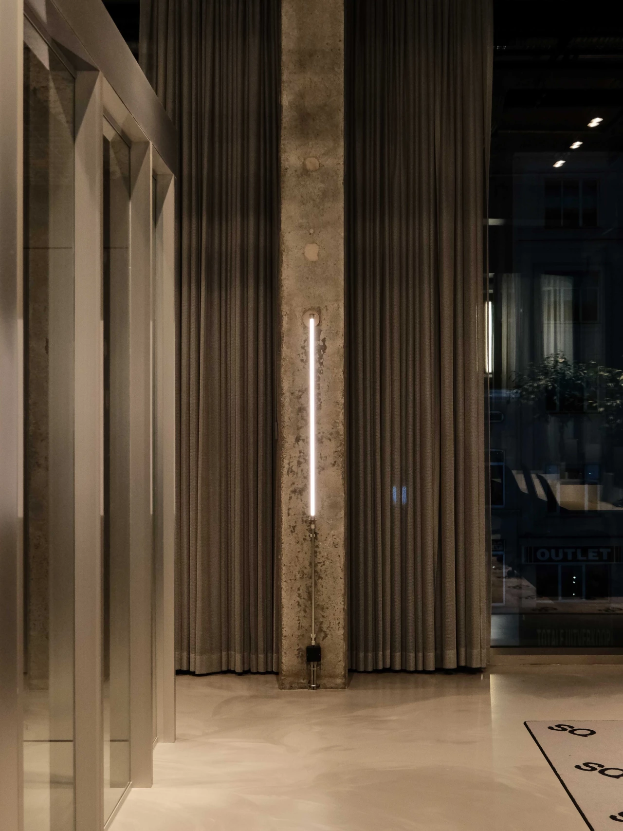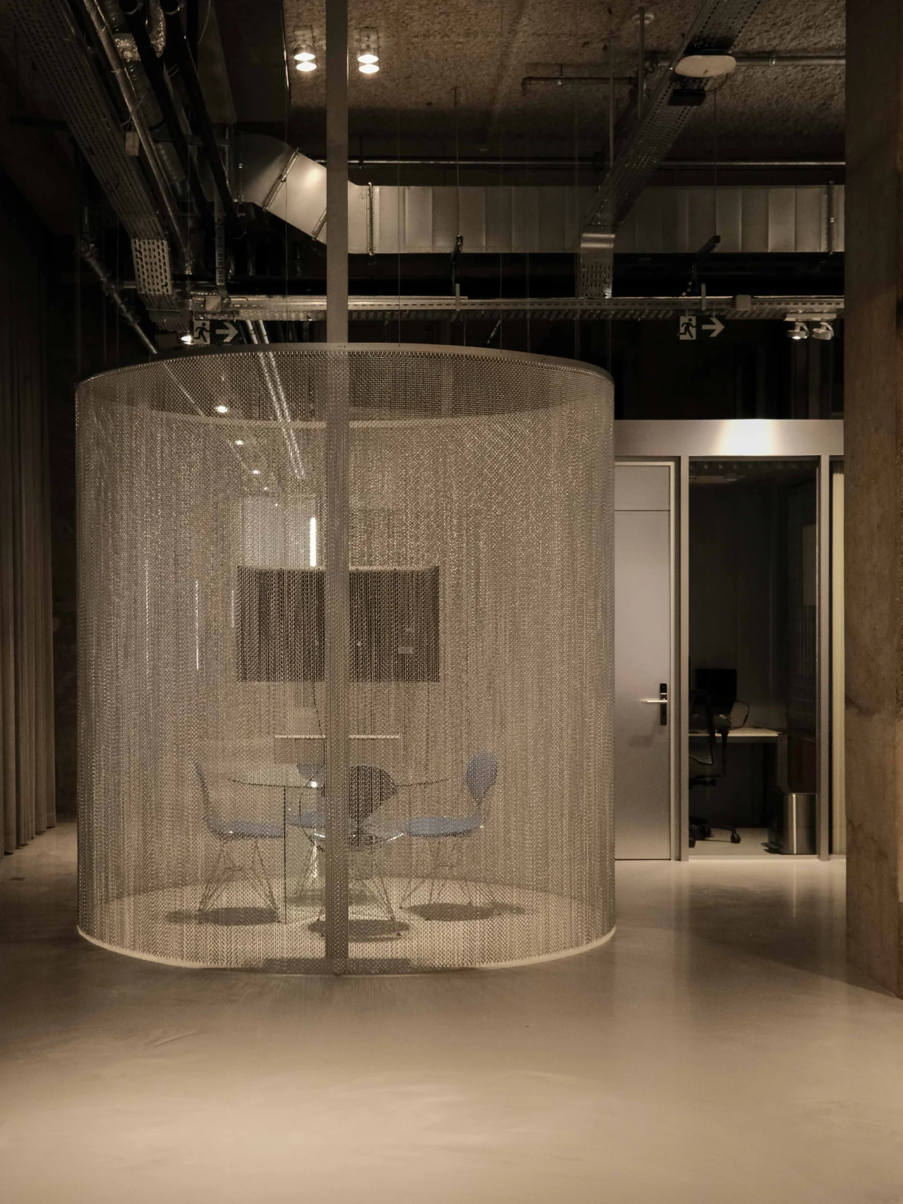 The tones can be described as different shades of grey: Concrete flooring combined with sleek brushed aluminium walls. An organizational light cage guides you from the entrance to the office spaces and splashes of colour and materials, such as full cork offices, stand out.