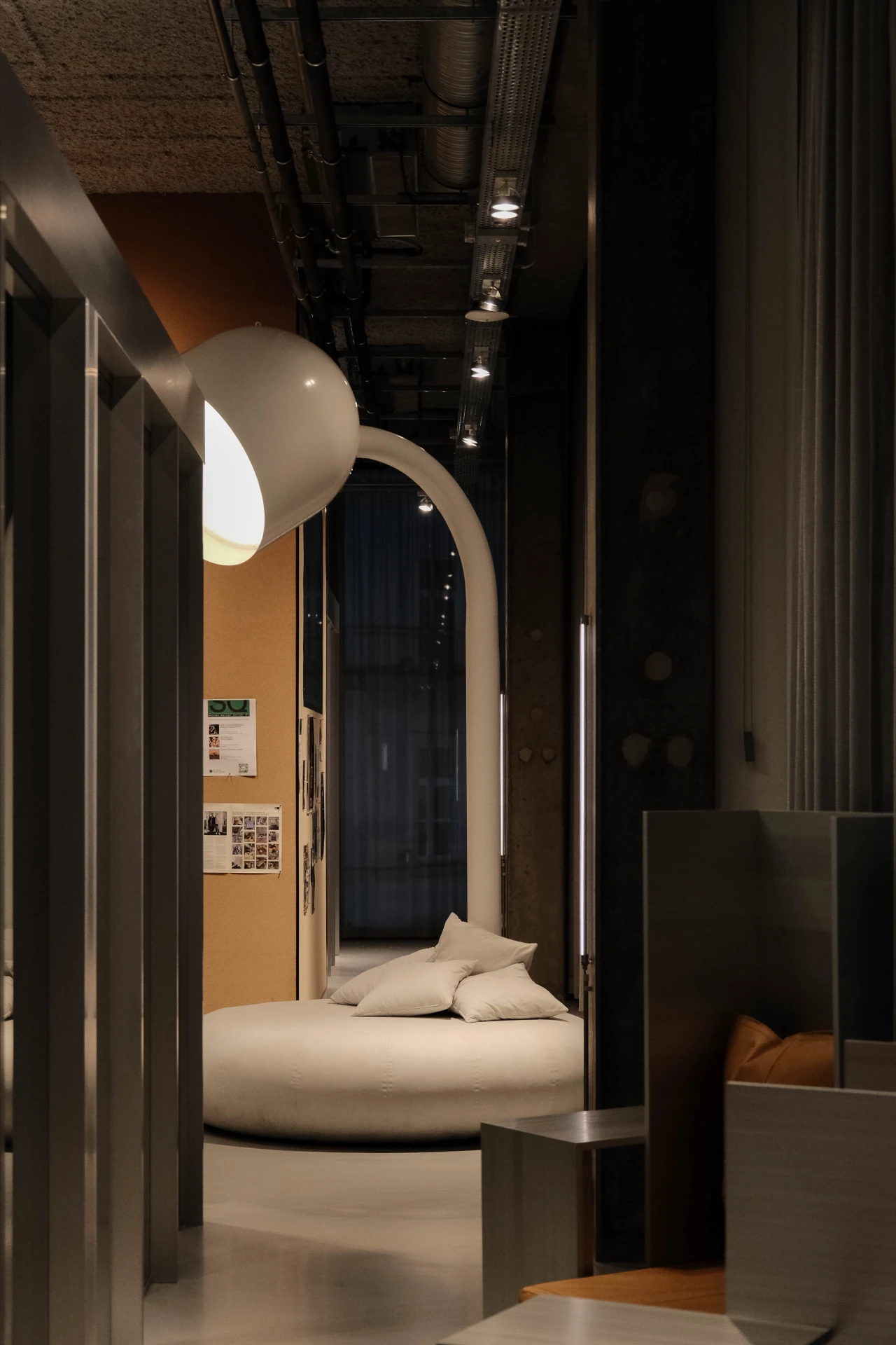 The office space has been conceptualized as a response to the modern office life. The seriousness of an office job is combined with playfulness and surrealism.